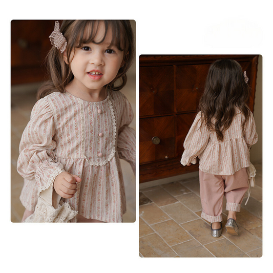 [90~130]ストライプフラワープリント トップス&パンツセット