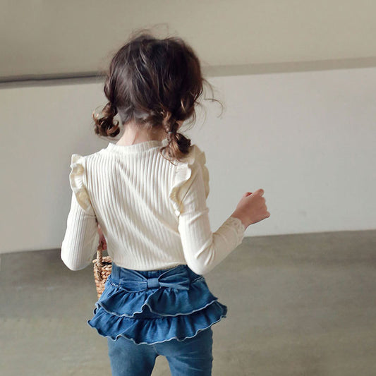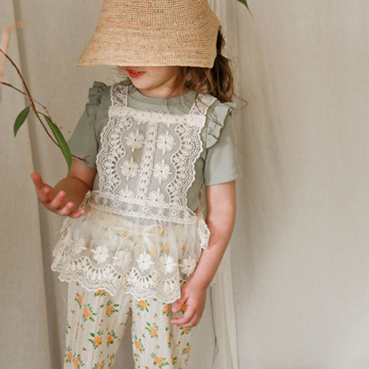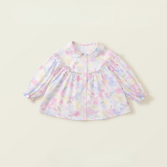 [90~140]フラワープリントブラウス&フリルデニムセット